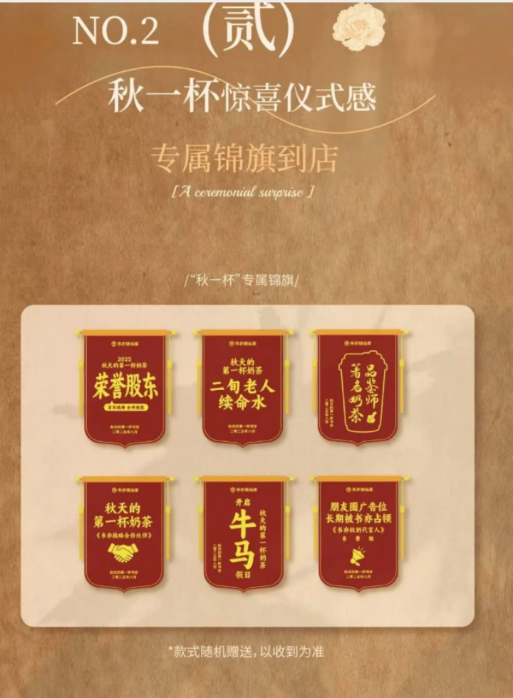也有品牌另辟蹊径,试图通过搞抽象出圈。例如书亦烧仙草立秋当天为“001号”订单顾客颁发“巨型秋奶锦旗”,锦旗文案包括“开启牛马假日”、“秋天的第一杯奶茶 二旬老人续命水”,还有蜜雪冰城发起,购买双杯饮品,在线下门店大喊“你是我的小苹果”,送1元零食。