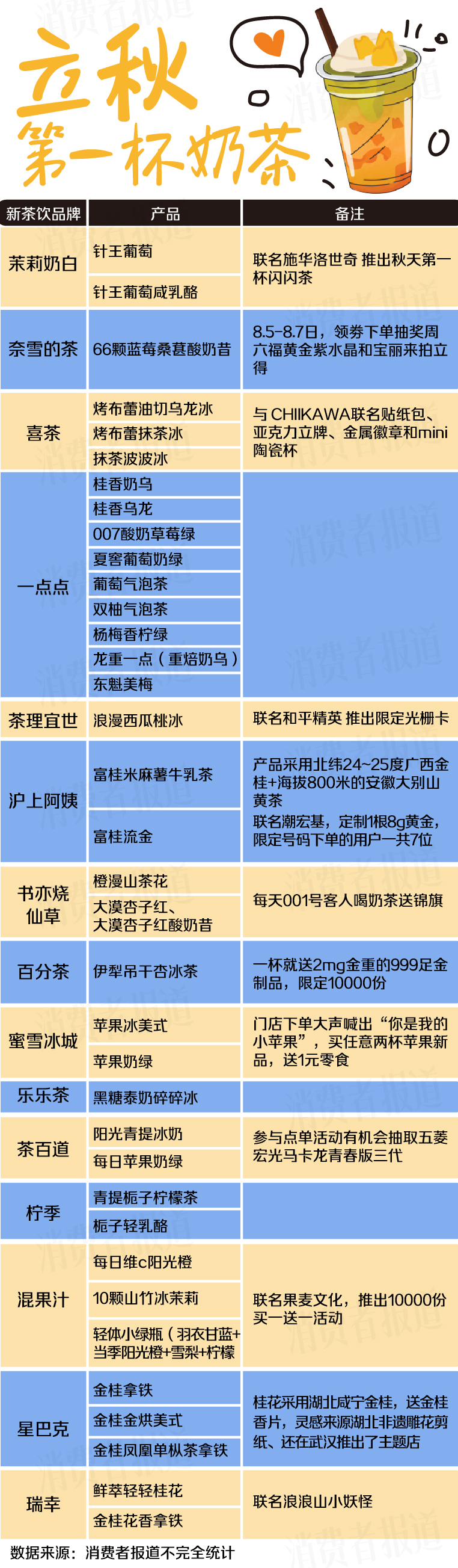 据《消费者报道》记者不完全统计,今年立秋前后,以“秋天的第一杯奶茶”为主题推新造势的茶饮品牌至少有15家,推出了36款新品,涵盖桂花、葡萄、青提、杏子等秋季应景口味。为了刺激消费,多个品牌还同步推出了买奶茶送黄金、送汽车、送锦旗等活动。