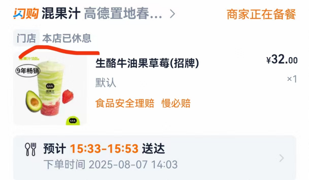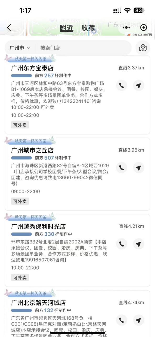 火爆态势一直持续到下午4时,记者在淘宝闪购、美团外卖等平台搜索发现,距离记者几百米至1.5公里范围内的奶茶门店普遍显示送达需60分钟以上。杨海晴(化名)告诉记者,她下午2点在广州珠江新城混果汁门店下单一杯饮品后,该门店就因为订单火爆而关闭了外卖接单,而她也在等待了100分钟后,才终于收到自己的饮品。