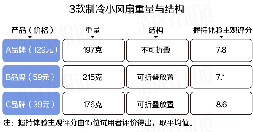消道长实测发现,3款制冷小风扇的重量在175-215克之间,这个重量基本和一台手机相当,不会带来明显的重量负担。