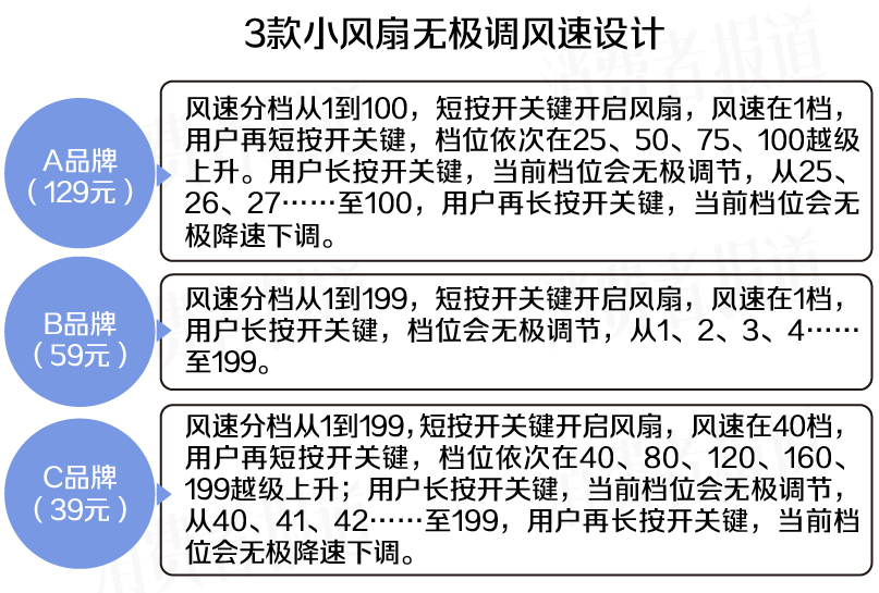 另外,3款小风扇都采用无极调风速设计。这种设计的优势是能为用户提供更丰富的档位选择,比如A品牌有100档、B品牌和C品牌有199档。但如果操作逻辑设计不当,无极调速则可能变成一把“双刃剑”,给用户带来不佳的调速体验。
