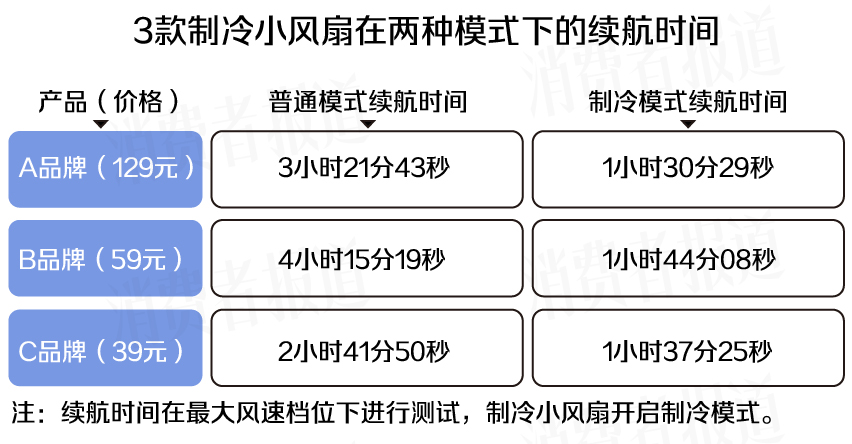 这表明,制冷模式下小风扇的耗电量显著增加。其中,B品牌在制冷模式下的续航时间整整减少了2.5小时。
