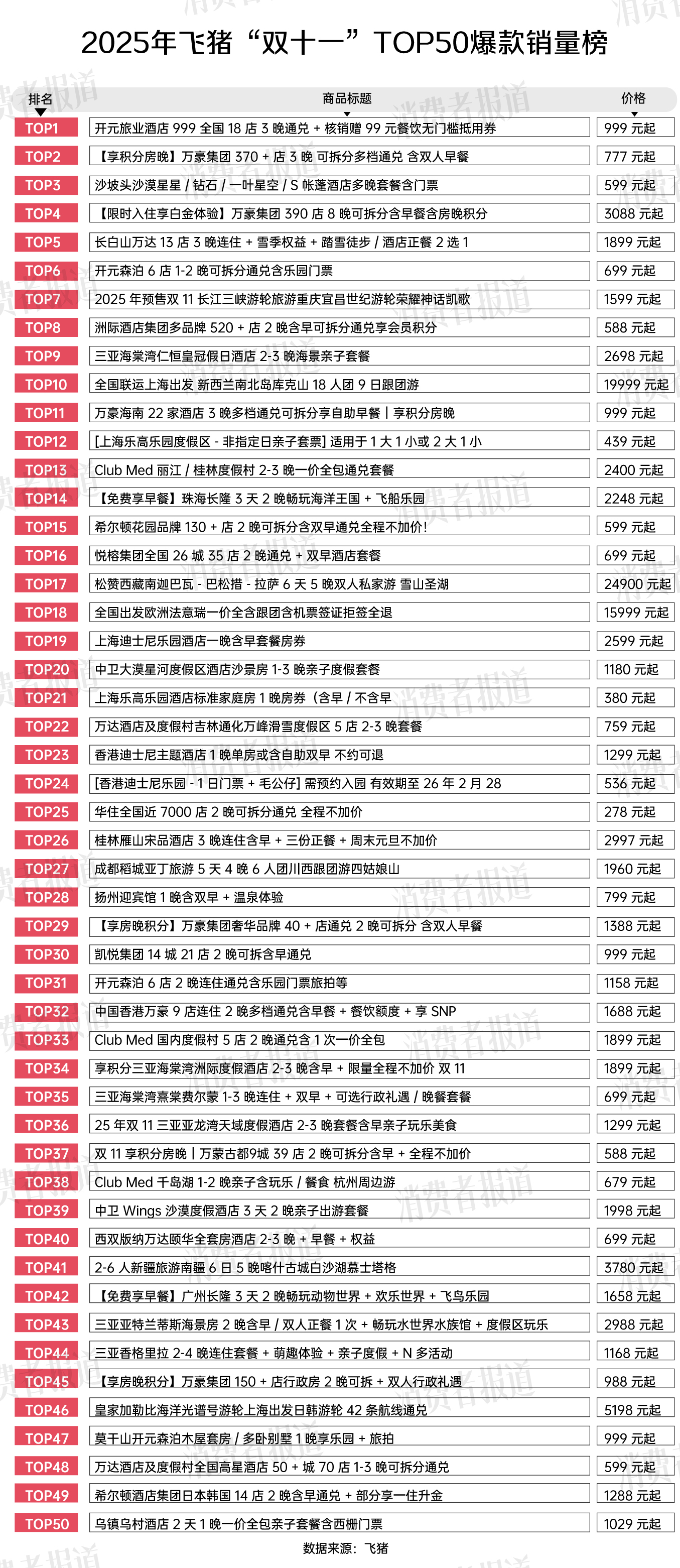 据飞猪11月11日发布的“双十一”TOP50销量榜,前50名中酒店类产品占比超过80%,开元、万豪、洲际、华住等品牌的“通兑套餐”表现突出。这些套餐普遍具备可拆分使用、全程不加价、含早餐权益等核心优势、例如,999元“开元酒店全国18店3晚可拆含早通兑”,777元起的三晚可拆分使用、含双人早餐“万豪集团370+店通兑(享积分房晚)”。通过一份套餐覆盖全国多店、多场景的灵活性,精准击中消费者“囤券备用、错峰出行”的需求,开元旅业、万豪集团推出的品牌爆款套餐销量均破10万套,GMV破亿。