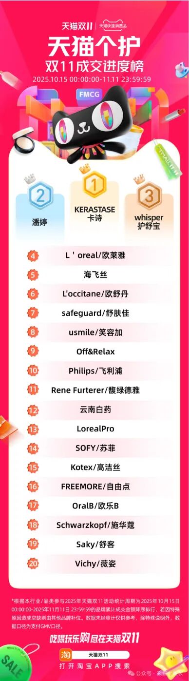 今年“双十一”收官后,天猫个护成交进度榜显示,卡诗连续两年蝉联榜首,印证沙龙级高端护发品牌的稳固地位。珀莱雅旗下头皮护理品牌Off&Relax新晋上榜即冲至第9名,展现细分品类黑马姿态。自由点从第6名降至第16名,而她研社跌出2025年榜单,显示女性护理领域竞争加剧。