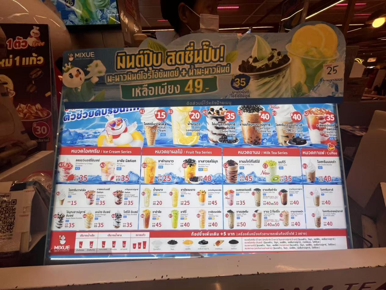 区别上述两家走中高端路线,蜜雪冰城在曼谷延续了极致性价比的路线。记者在曼谷门店注意到,其冰淇淋定价是15泰铢(约3元人民币),冰鲜柠檬水定价20泰铢(约4元人民币),与国内保持一致。门店内多数顾客使用泰语点单。