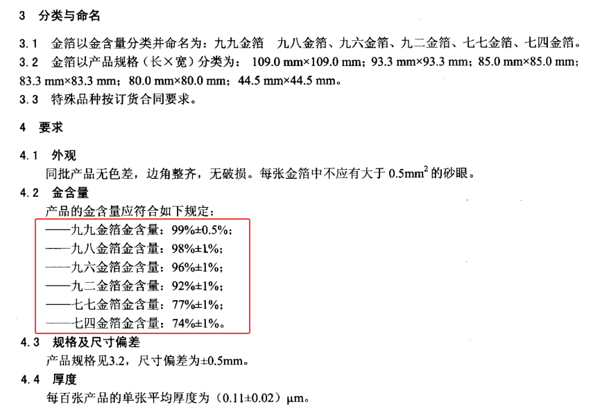 根据中华人民共和国轻工行业标准《金箔》(QB/T 1734—2008),用于金箔生产的黄金含量通常在74%~99%之间,并根据含金量的不同划分为九九金箔、九八金箔、九六金箔、九二金箔、七七金箔、七四金箔6种。需要注意的是,此标准下的金箔仅适用于建筑及雕塑贴金、中成药裹金、家具与工艺品装饰等,并非食品用途。