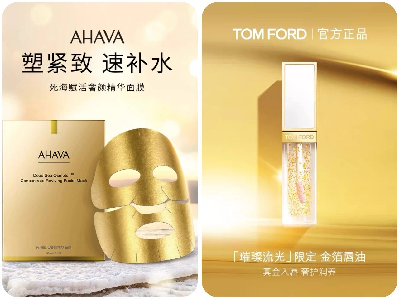 左:AHAVA金箔面膜 右:TOM FORD金箔唇油 图源:电商购物平台