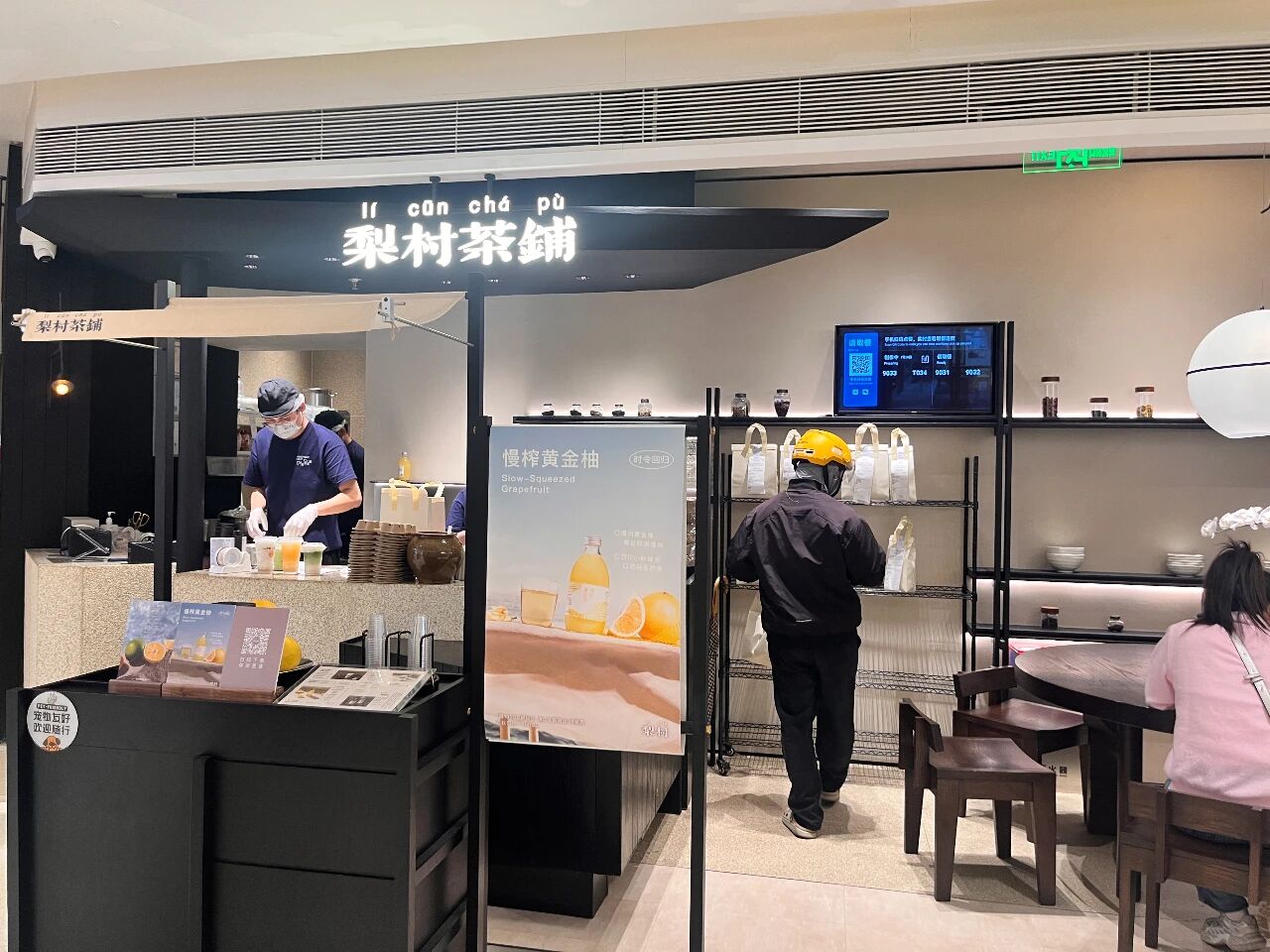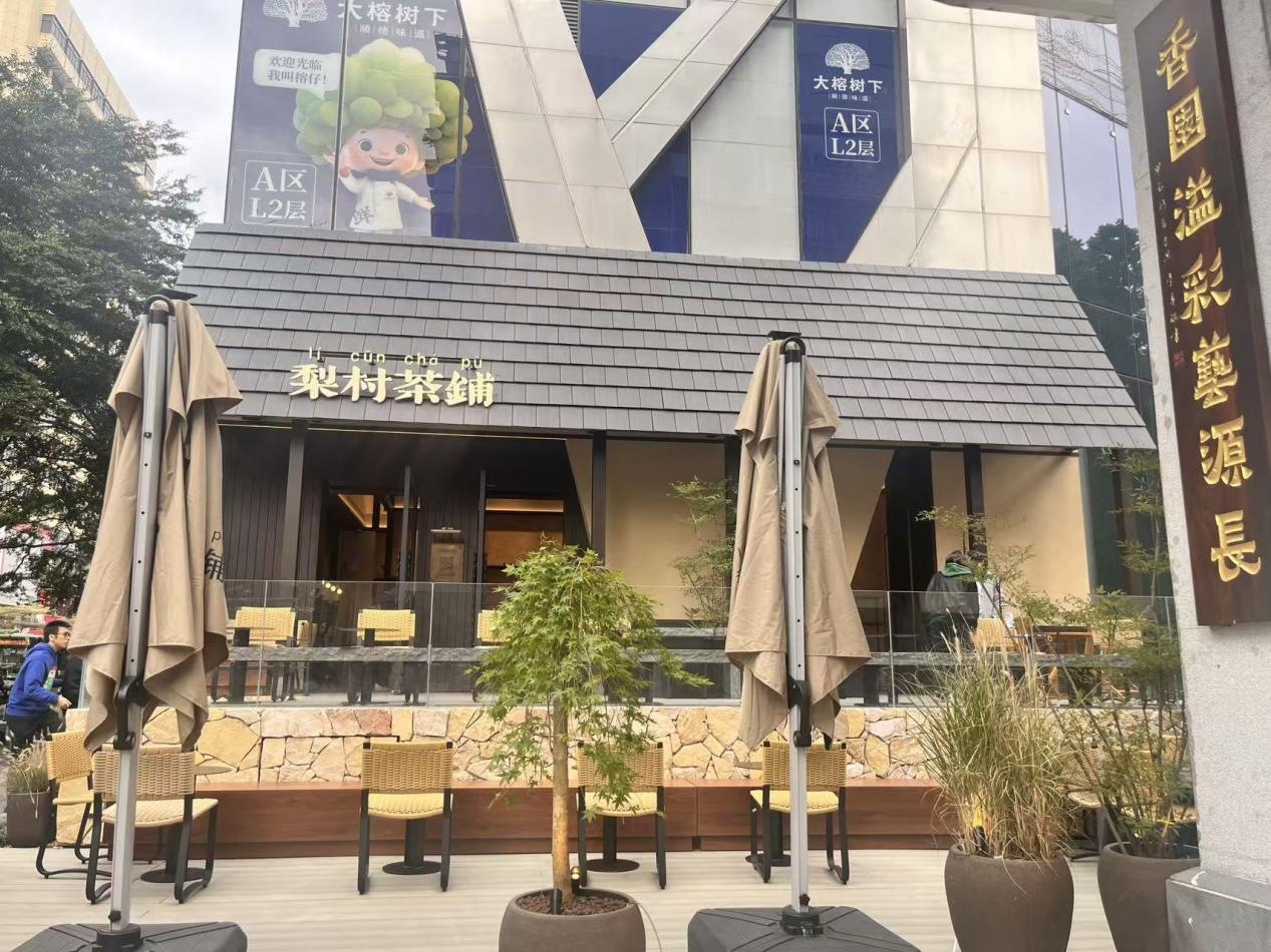 近日,记者走访时发现,梨村茶铺富力海珠城店延续了芳村店的大空间与茶铺庭院设计,而东方宝泰店和万菱汇店则并没有给消费者留太多座位、空间,尤其是万菱汇店,仅放置了一张堂食桌椅,主要做取餐外带。