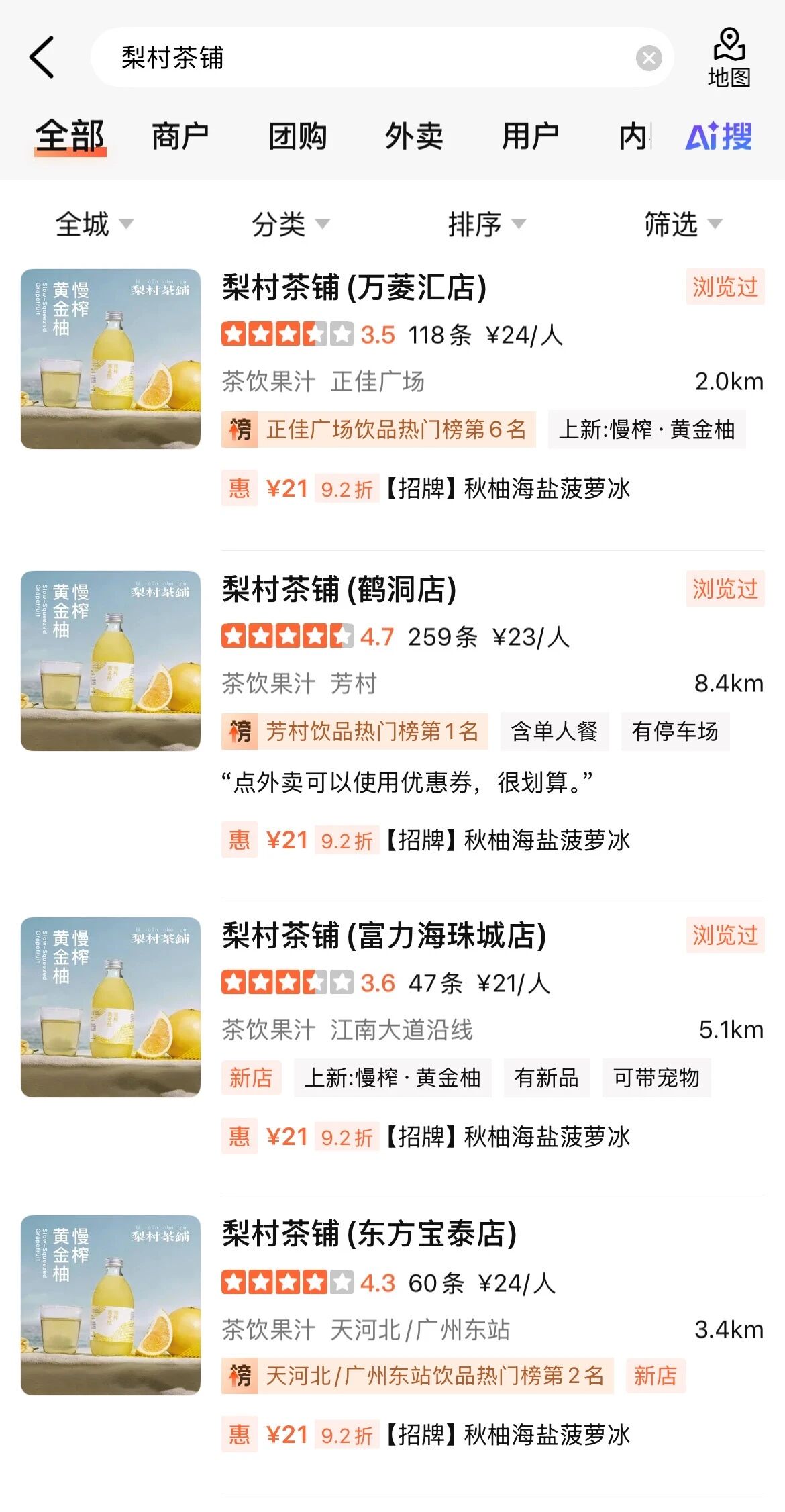 当前在大众点评,梨村茶铺新店的评分显著低于其芳村老店。