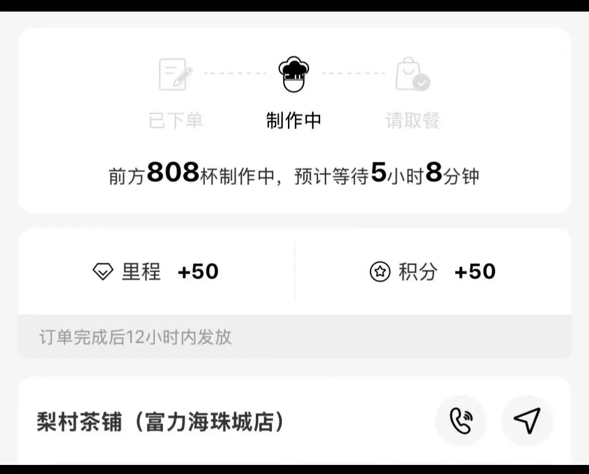 首先是效率问题。梨村茶铺菜单围绕着大量鲜果打造,这决定了其饮品在备料与制作环节均耗时耗力。根据多名在新开店首日等待数小时才喝上饮品的消费者提供的信息,按下单时间及取餐时间计算,梨村茶铺不同门店的出餐速度大约在每小时160~180杯。同时,记者也在正常人流的情况下于梨村茶铺不同门店现场下单,发现出单速度大约在一分钟3杯左右(即每小时约180杯)。