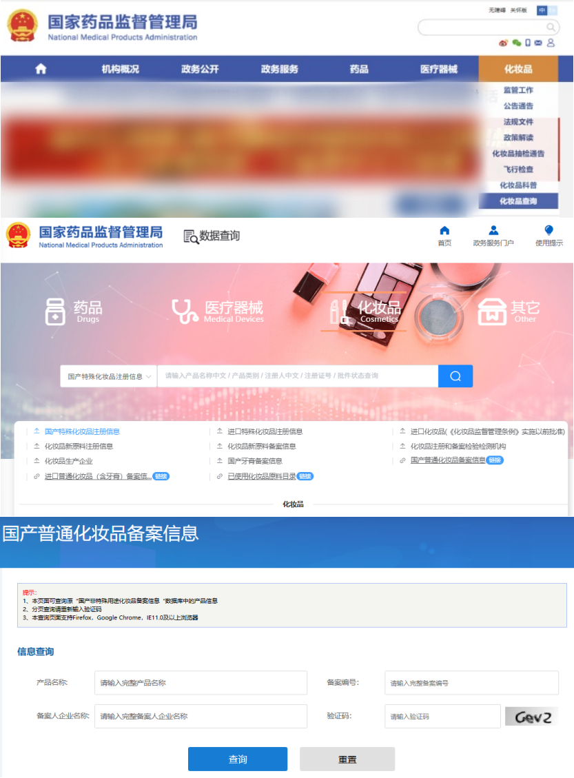 第二步,查信息、验身份。消费者在确定好品牌及产品后,可通过国家药监局官方网站,点击“化妆品查询”一栏,进入数据查询页面,再根据分类来查询化妆品的备案信息。消费者查询时,注意要输入完整的产品名称,如果查询不到备案信息,建议不要购买,并拨打12315举报。