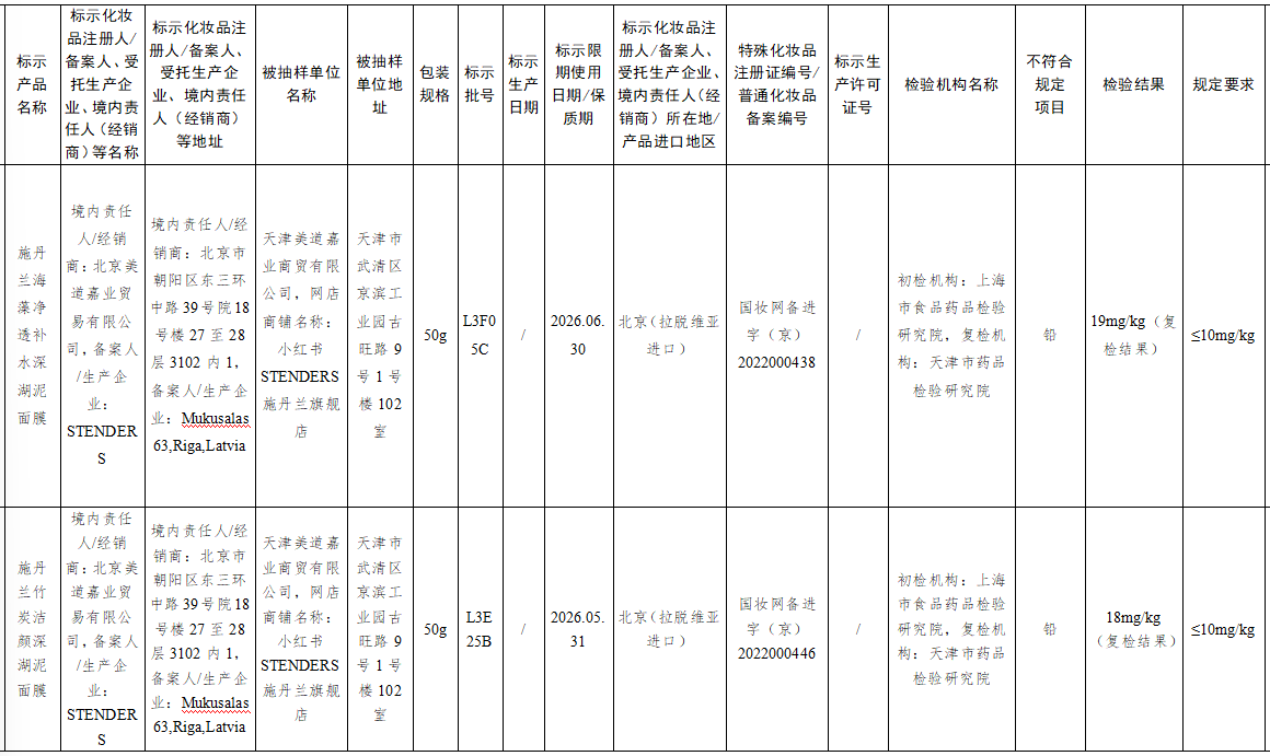 近日,国家药监局发布关于48批次不符合规定化妆品的通告(2025年第41号)。细心的网友发现,常被誉为拉脱维亚“国宝级”品牌的施丹兰有两款产品出现在此次不合规名单,分别标称“施丹兰海藻净透补水深湖泥面膜”和“施丹兰竹炭洁颜深湖泥面膜”。产品样品的铅含量分别达到19mg/kg和18mg/kg,超出规定要求的10mg/kg上限。