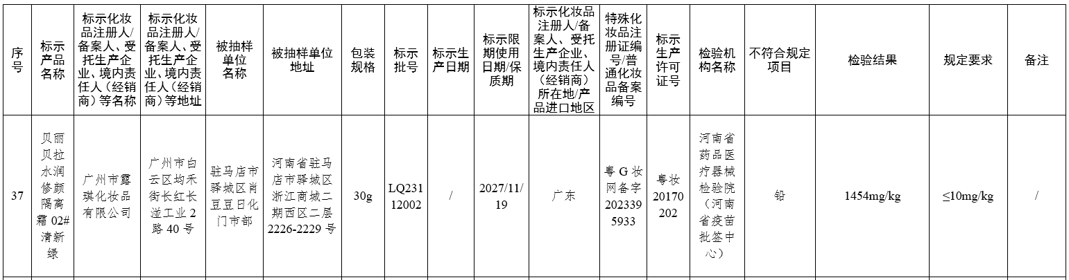 2023年7月,江苏省消保委发布美白祛斑产品比较试验分析报告,有5批次产品重金属超标。今年3月,国家药品监督管理局发布通告,一款产品标签标示名称为贝丽贝拉水润修颜隔离霜02# 清新绿不符合规定项目,该批次产品铅超标145.4倍,达1454mg/kg。