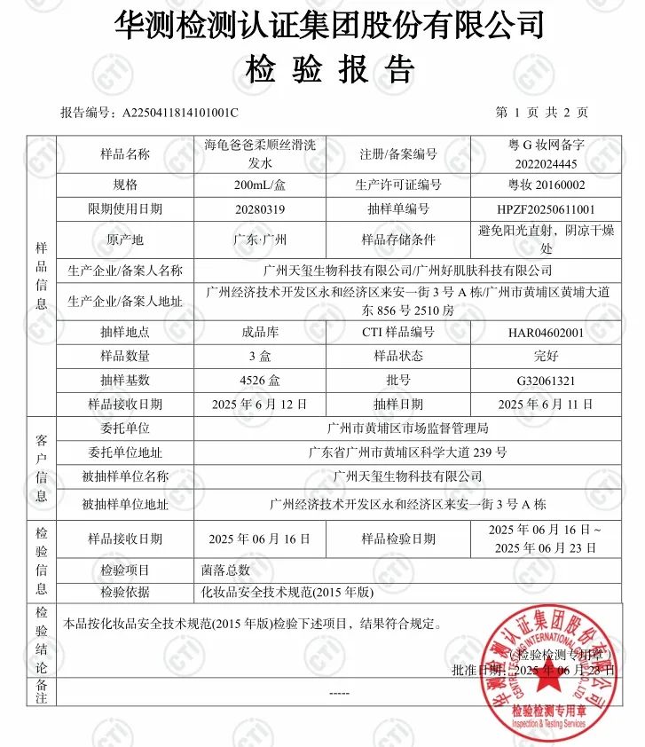 从报告“检验信息”栏可以看到,批号为G32061321的海龟爸爸柔顺丝滑洗发水样品接收日期为2025年6月16日,样品检测日期为2025年6月16日至6月23日。“检测结论”显示,该样品按《化妆品安全技术规范》(2015年版)检验菌落总数项目,结果符合规定。检测机构为华测检测认证集团股份有限公司,落款日期为2025年6月23日。
