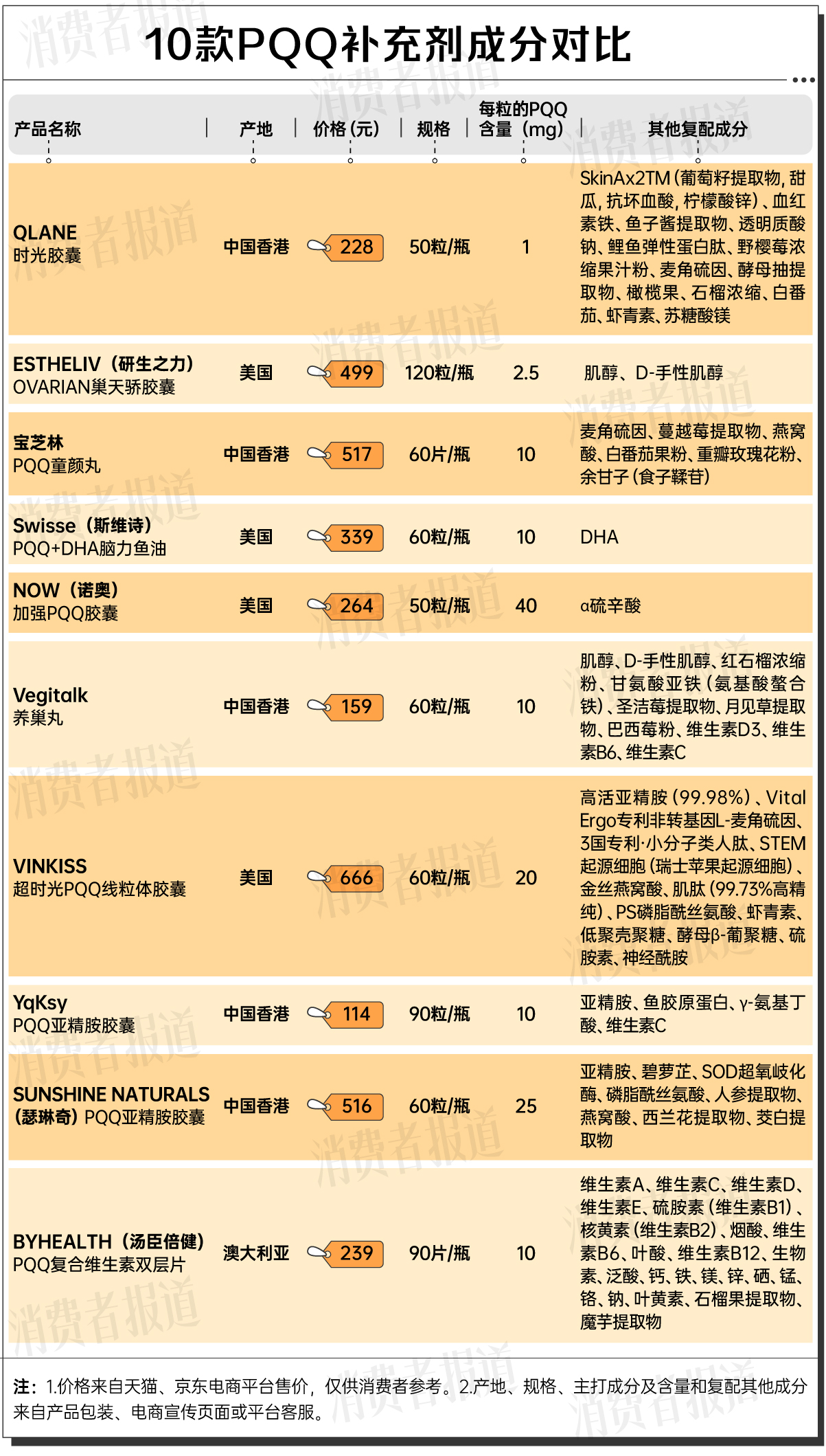 为了解市售PQQ补充剂的价格、有效成分含量等,《消费者报道》对比了电商平台上热销的10款产品。这些产品产地集中,主要来自中国香港(6款)和美国(3款),另有1款产自澳大利亚。从规格看,单瓶60粒装最为常见,通常可满足一个月用量。