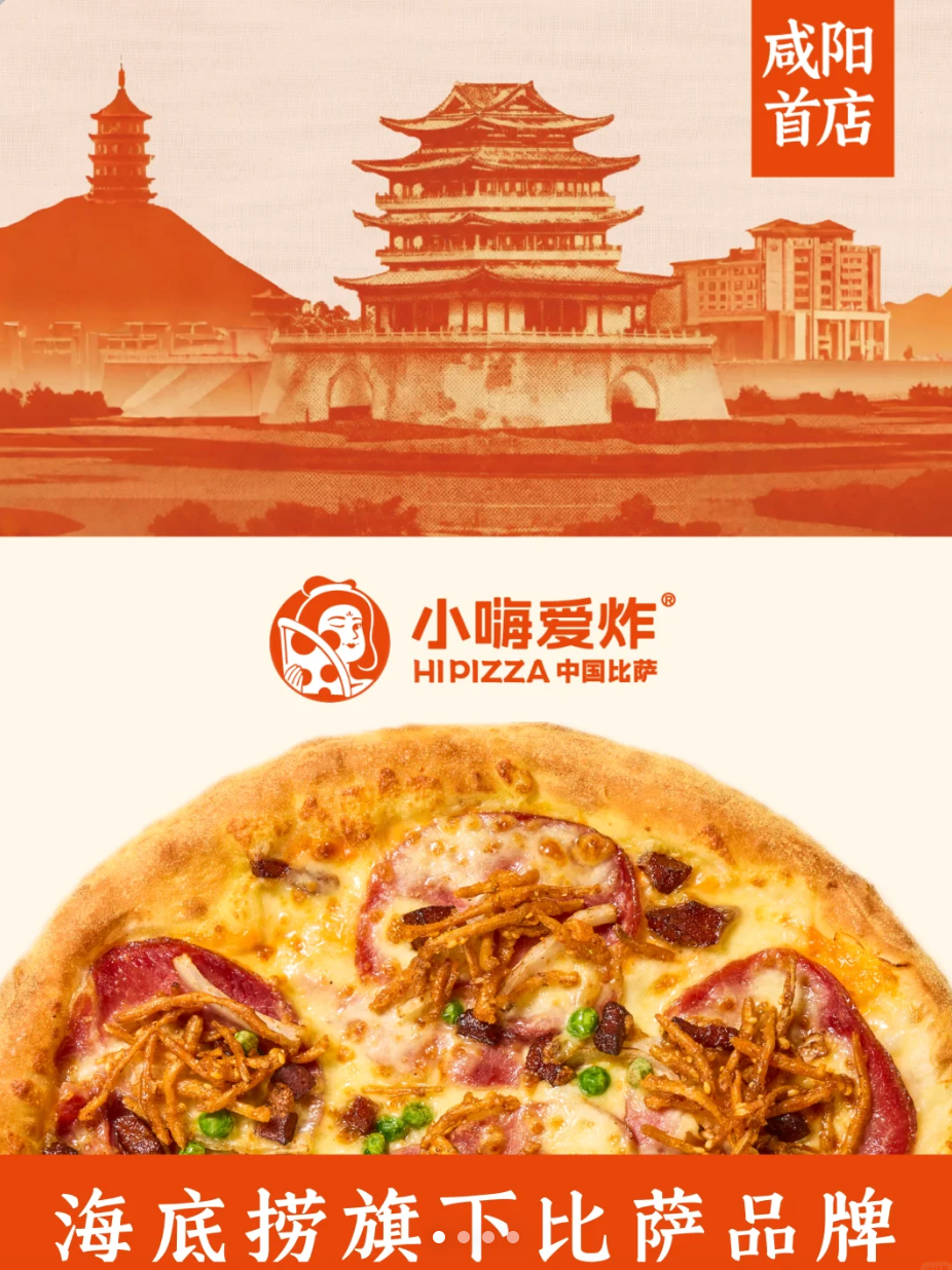 不只塔斯汀,记者注意到,近日海底捞旗下此前聚焦于“拌酱炸鸡”的餐饮品牌小嗨爱炸,也在咸阳开出一家标识为“小嗨爱炸中国比萨”的门店。