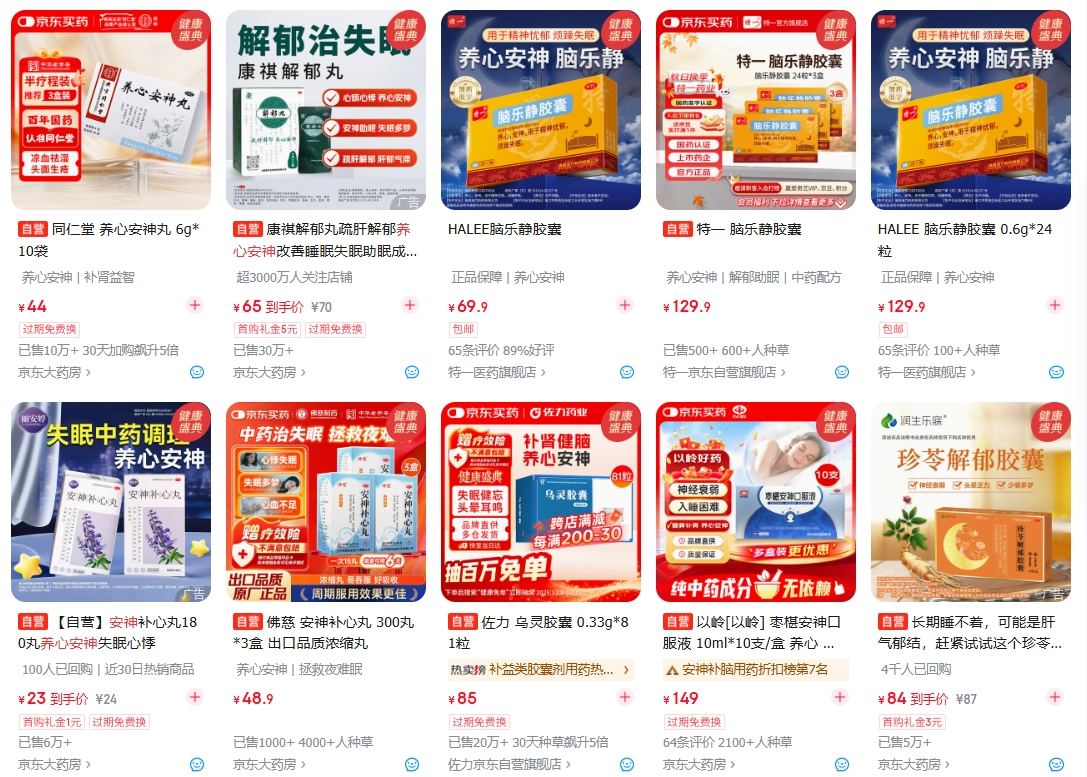 京东平台上,养心安神类药品如同仁堂养心安神丸、康祺解郁丸、佐力乌灵胶囊等药品,凭借深厚的市场根基,总销量为10万~30万件,遥遥领先于特一药业的脑乐静胶囊(累计销量500+件)。此外,市场上还有Swisse、汤臣倍健等国内外保健品牌,它们通过更时尚的营销方式和更广泛的市场教育,牢牢占据着年轻消费群体的心智。