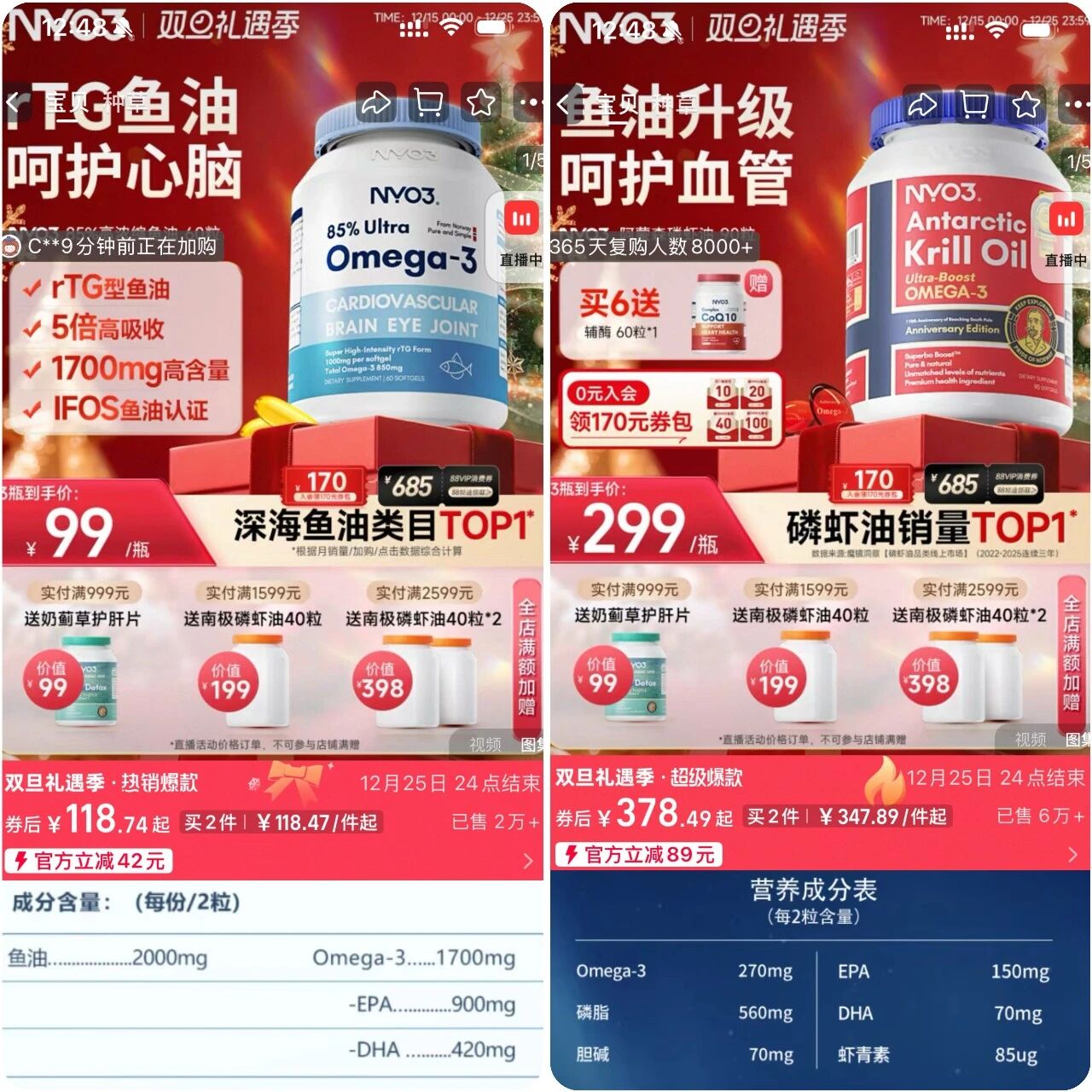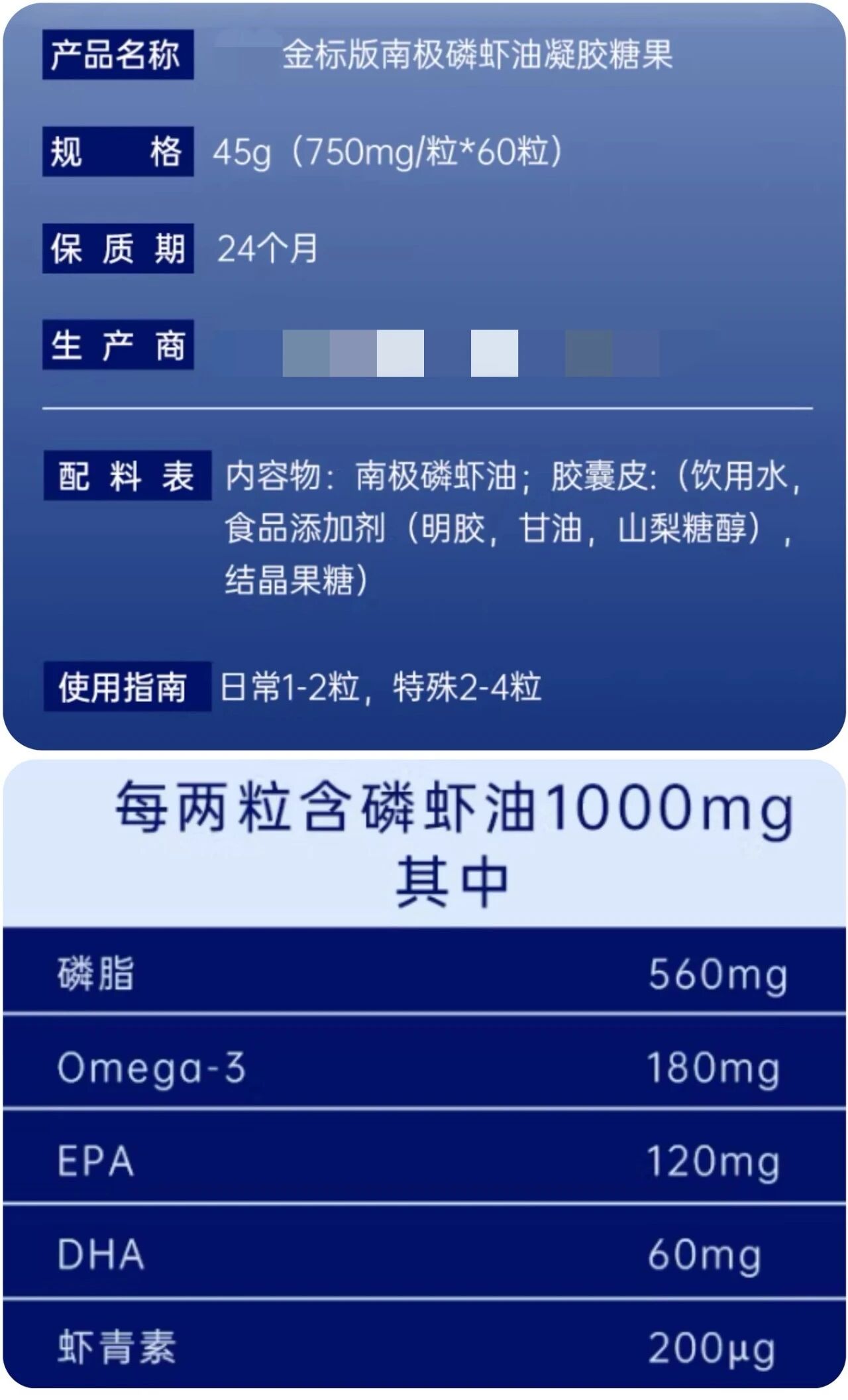 以电商平台上一款热销的南极磷虾油凝胶糖果为例,其每粒含磷虾油500毫克,其中Omega-3为90毫克。若想达到研究中每日2克的起效剂量,每日需服用4粒;若追求2.9克的上限剂量,则需服用近6粒。但该产品包装上的建议每日食用量仅为1-2粒,这意味着,如果按产品包装推荐量服用,实际摄入的磷虾油仅有研究有效剂量的1/4至1/2。