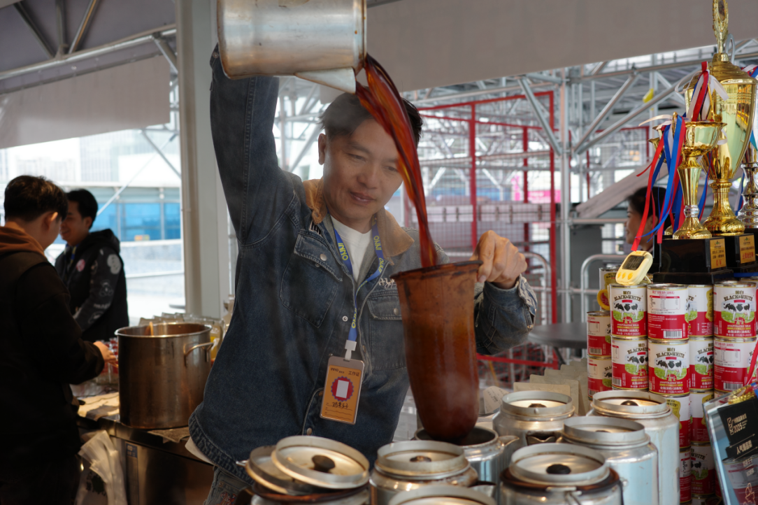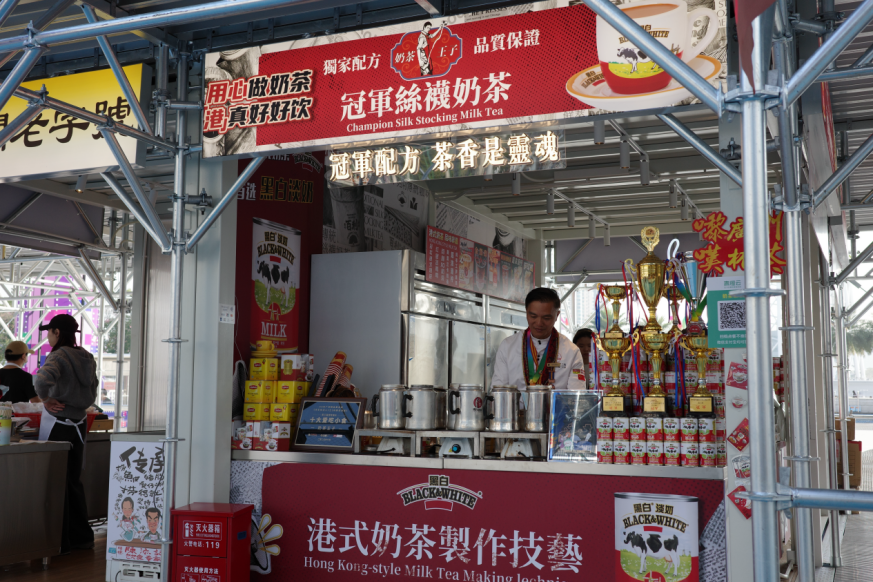 “奶茶王子”的摊位前,有不少游客前往拍照打卡。该店内奶茶的售价区间在25~38元,品牌创始人陈伟雄先生(Jackie Chan)接受《消费者报道》记者采访时表示,“这次的价格比原来还要便宜50%,因为我们在五星级酒店里有售卖这些奶茶。”据其介绍,其产品早已进驻香格里拉、丽思卡尔顿等高端酒店,是名副其实的星级奶茶。