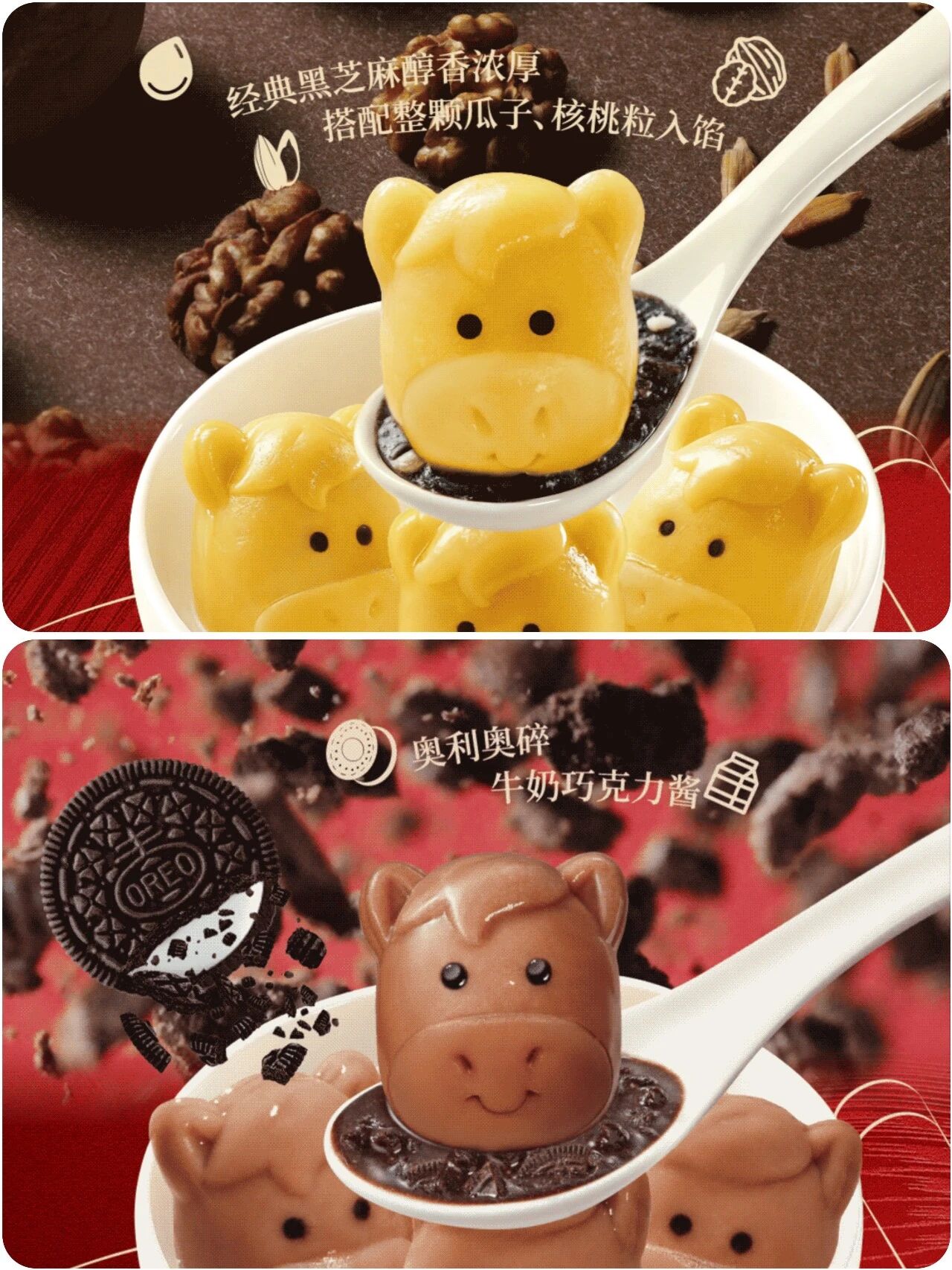 三全与周大生联名推出的“马到成功”系列汤圆,外观是圆滚滚的小马造型,黑芝麻味“黄金小马”灵感源自热门金饰,奥巧味则包裹奥利奥饼干碎,应景又新奇。