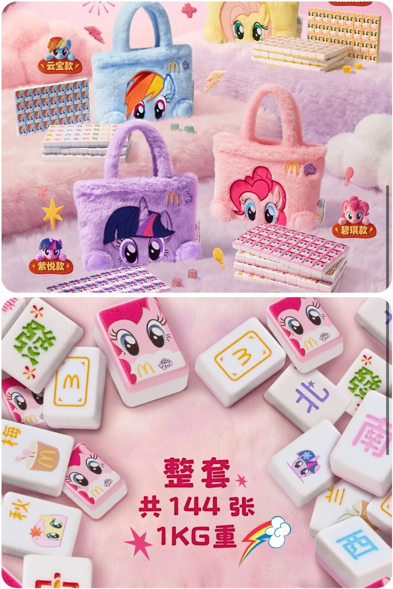 麦当劳也官宣了与《小马宝莉》的联名。自2月17日10:45起,麦当劳“小马宝莉迷你麻将毛绒套装”将上架发售,任意消费满30元,加58.8元可随机换购一副。