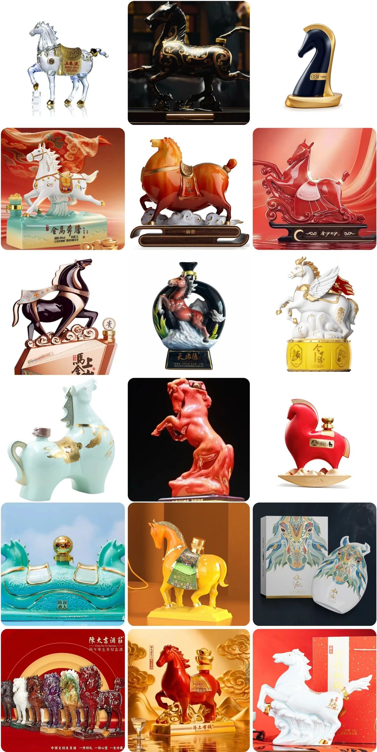 设计上,这些产品广泛汲取中国经典艺术养分,唐太宗战马“飒露紫”、韩干《牧马图》、汉代青铜器铜奔马“马踏飞燕”、敦煌壁画“翼马”等皆成为灵感来源,近半数产品更直接以神韵各异的“骏马”造型为瓶身。