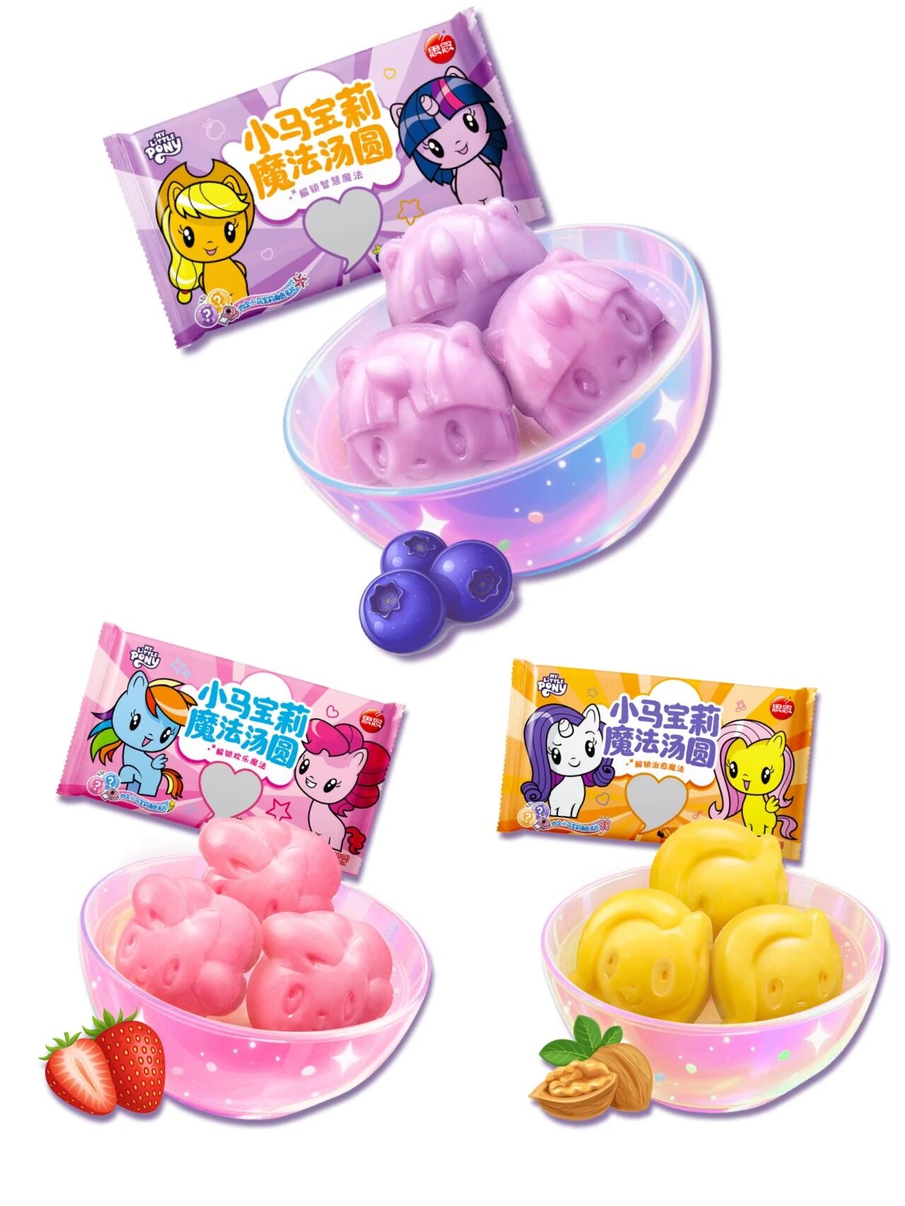 另一边,思念与《小马宝莉》合作推出了“美味魔法 思念加码”3D立体小马汤圆,粉色、黄色、紫色包装分别对应草莓(碧琪造型)、黑芝麻(柔柔造型)与蓝莓(紫悦造型)口味,每包还附赠随机角色卡片。