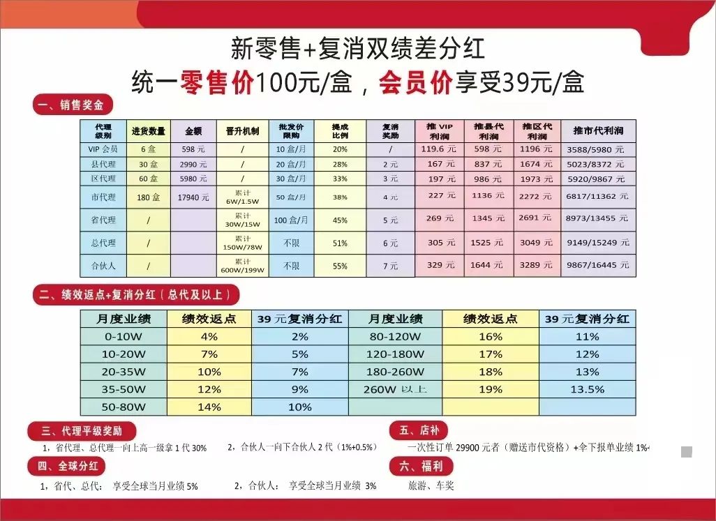 《消费者报道》记者调查发现,该产品仅为普通食品,却在其私域社群中被宣传具有“调节血糖、促进儿童大脑发育”等保健功效,涉嫌违规。其商业模式问题更为突出:产品设置了7级代理返利机制,收益核心并非销售产品,而是“拉人头”。例如,推荐一名新“县代理”可获837元奖励,相当于直接销售近77盒产品的收入。此模式与此前涉传的隆力奇“倍莱鲜羊奶粉”高度相似。