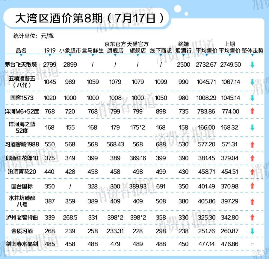 在7月17日统计的第八期《大湾区酒价》中的,白酒整体价格总体相比7月初微弱下跌。在统计的13款白酒产品中,6款白酒相比上期价格下跌,另有6款白酒价格延续上期上涨态势,1款白酒价格保持平稳。13款白酒平均价格由涨转跌,下跌幅度为3.25元/瓶。