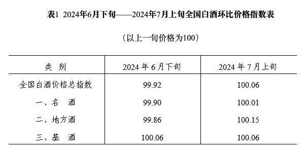 据泸州·中国白酒商品批发价格指数办公室最新发布数据,2024年7月上旬全国白酒环比价格总指数为100.06,上涨0.06%。从分类指数看,名酒环比价格指数为100.01,上涨0.01%;地方酒环比价格指数为100.15,上涨0.15%;基酒环比价格指数为100.06,上涨0.06%。