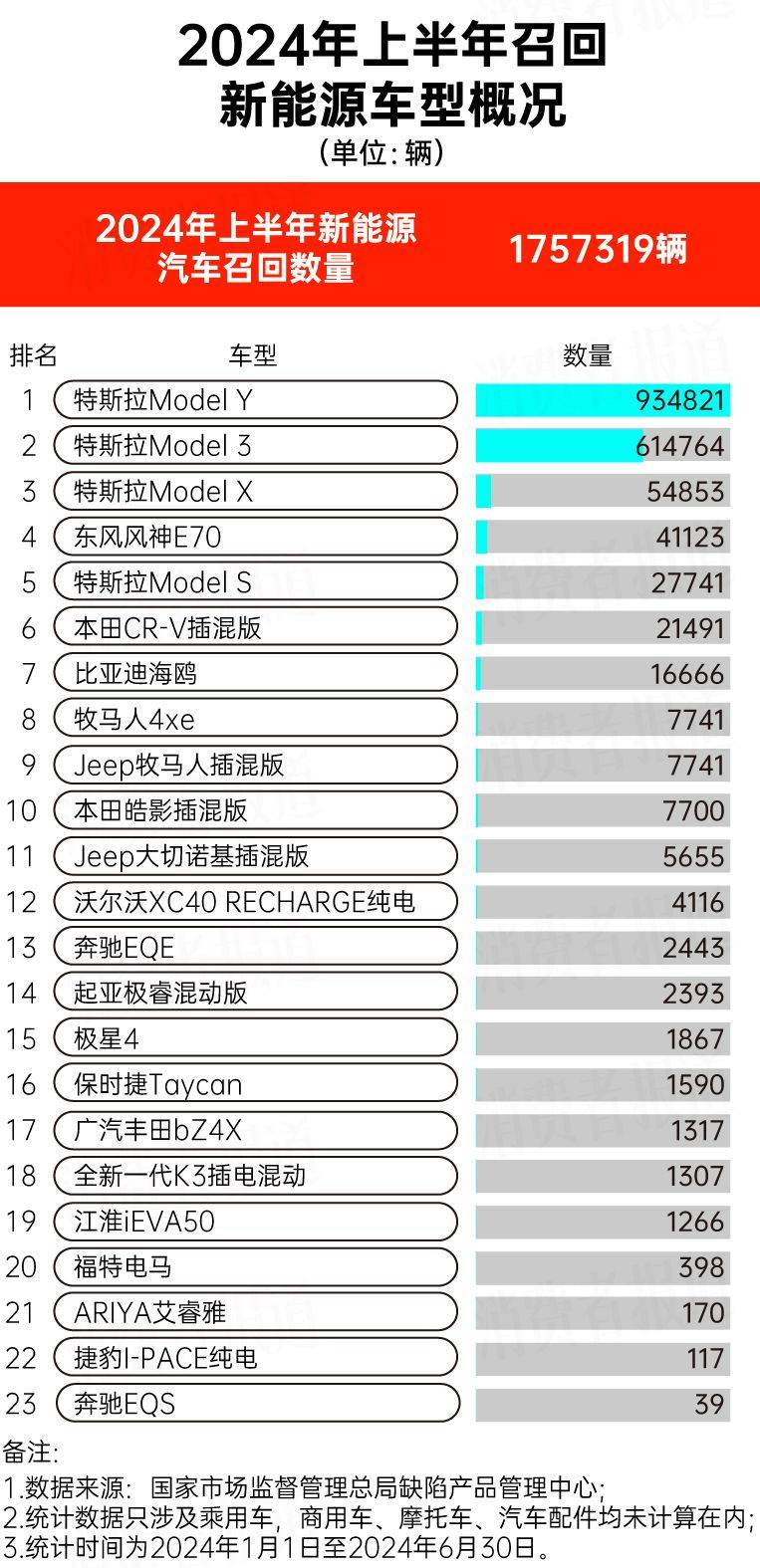 今年上半年,共有超过175.7万辆新能源汽车被召回,占比超过43%。其中,召回数量前五名的新能源车型中,特斯拉的车型占据四席。此外,比亚迪海鸥有超过1.6万辆汽车被召回,本田CR-V插混版召回超过2.1万辆。