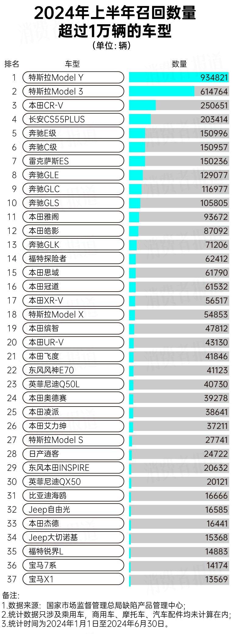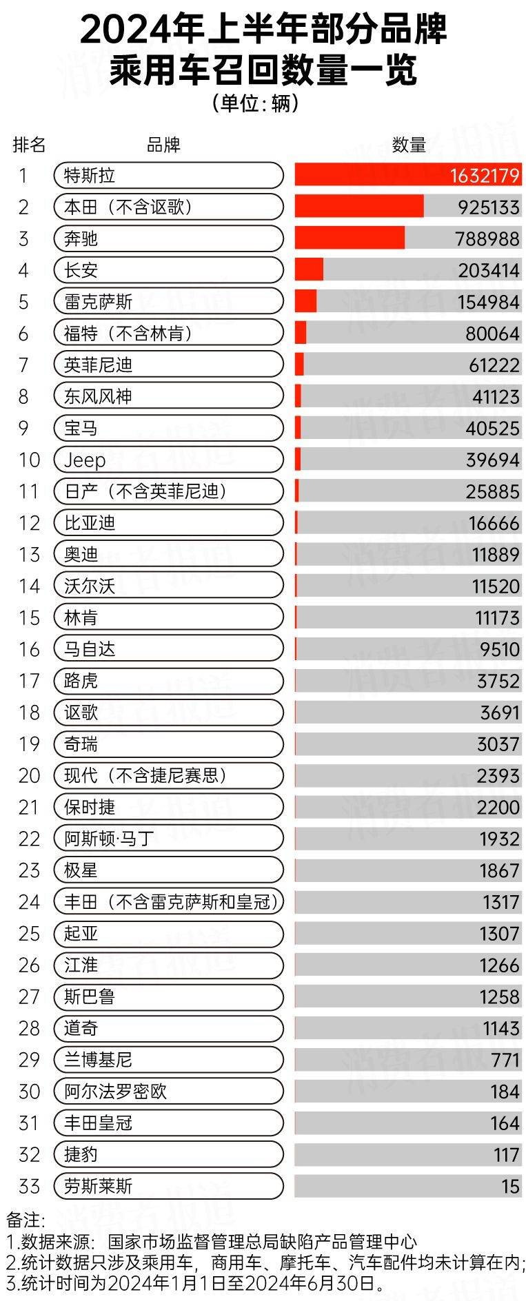 2024年上半年,特斯拉召回数量最多,召回超过163.2万辆汽车。排在其后的本田(不含讴歌)召回超过92.5万辆汽车,而奔驰也召回近78.9万辆汽车。自主品牌中,长安召回数量最多,召回超过20.3万辆。