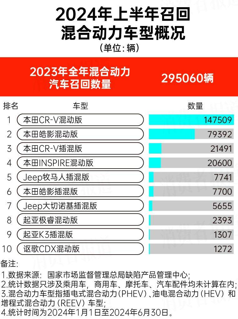 此外,2024年上半年共有超过29.5万辆混合动力车型在召回行列,包括本田CR-V混动版、本田皓影混动版、本田INSPIRE混动版等。