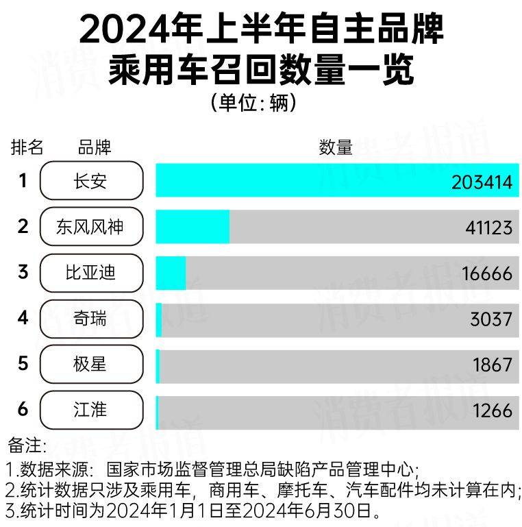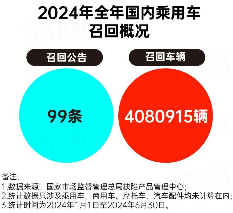 2024年1月1日至2024年6月30日,国家市场监督管理总局产品缺陷中心共发布99条国内乘用车召回公告,召回车辆总数超过408万辆。需要注意的是,商用车、摩托车、汽车配件等的召回数据并未计算在内。