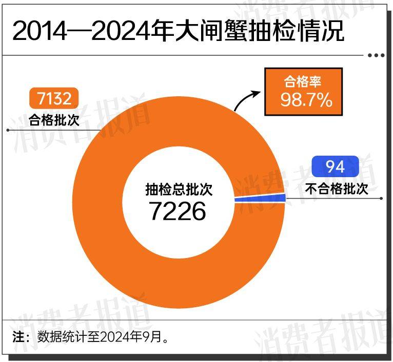 根据国家市场监督管理总局收录的数据,自2014年以来,共抽检大闸蟹7226批次,其中合格为7132批次,不合格为94批次,合格率为98.7%。