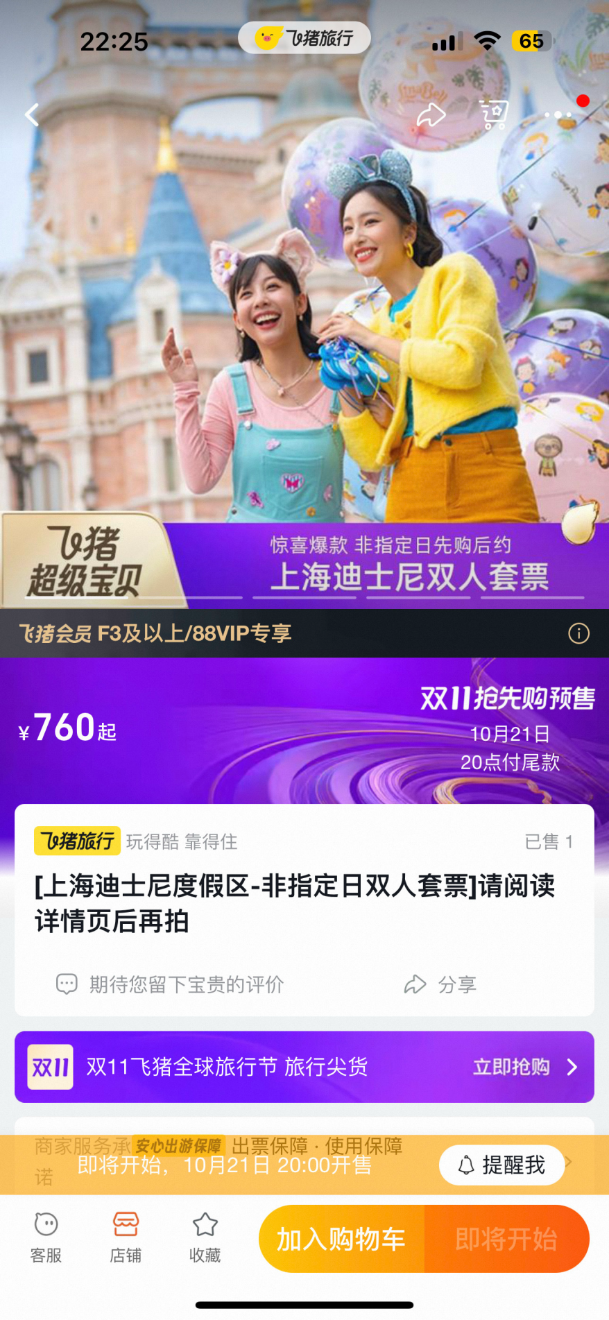 自10月14日起,各大电商平台开启了双11预售活动,“760元起步的上海迪士尼度假区双人套票”成为最值得囤的经典门票之一。连日来,消费者们纷纷在飞猪平台和李佳琦直播间里抢先支付了50元定金,希望能够在预售期间锁定这一双11大促的优惠。