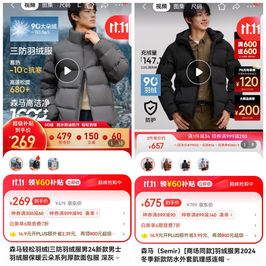 森马京东官方旗舰店信息显示,清洁度为1000mm的云朵系列三防男款羽绒服售价479元,双十一优惠价269元。而一款清洁度700mm+、防水连帽男款羽绒服售价799元,双十一优惠价675元。值得注意的是,后者充绒量更少,如其XL码衣长70.5cm、充绒量为147.1 g,而前者XL码衣长72.5cm、充绒量为162.7g。