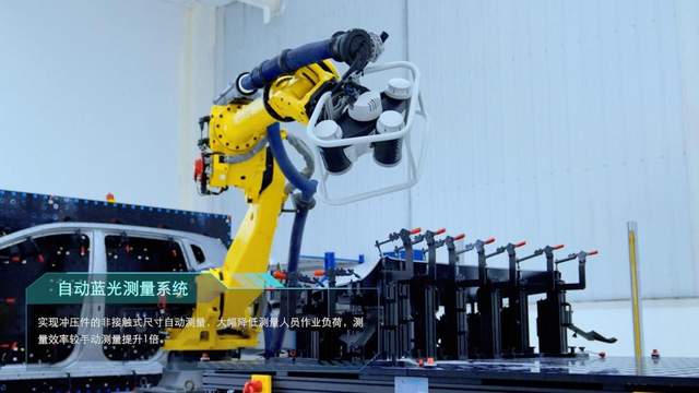 为了让车辆零件更加精益求精,昊铂新能源灯塔工厂冲压车间还采用自动化蓝光扫描+人工抽检的方式筛选瑕疵零件。其中,高精度的自动蓝光机器人扫描技术,连肉眼看不见的非常细微的瑕疵都能发现,用火眼金睛实现零件做工的最严苛标准。