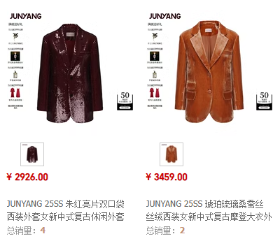 《消费者报道》记者在JUNBYYANGJUN旗舰店搜索发现,五条人购买的两件外套均为JUNYANG 2025年春季女装新款,其中仁科所穿外套为安哥拉红亮片新中式复古休闲外套,目前折后价为2926元;茂涛的棕色西服为JUNYANG 桑蚕丝丝绒复古摩登西装外套,目前折后价为3459元。而这两款衣服均显示可接受“7天无理由退款”。