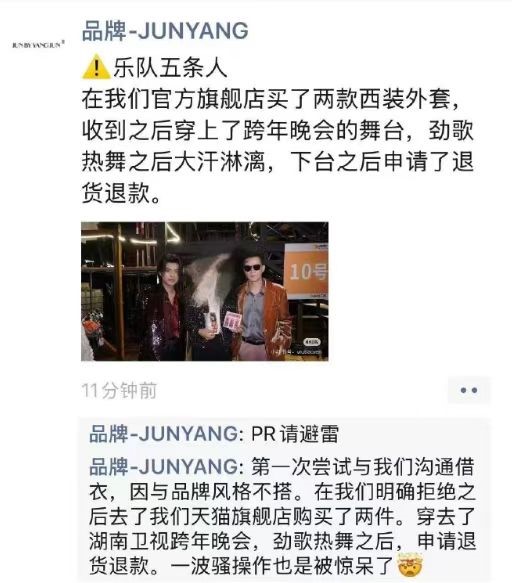 引起风波的正是这两件西服。据JUNYANG 品牌的发文,五条人一开始与其沟通借衣事宜,但因双方风格不匹配予以明确拒绝。随后,乐队在其天猫旗舰店购买了两件西装外套,并穿上了湖南卫视跨年晚会。劲歌热舞之后,他们申请了退货退款。