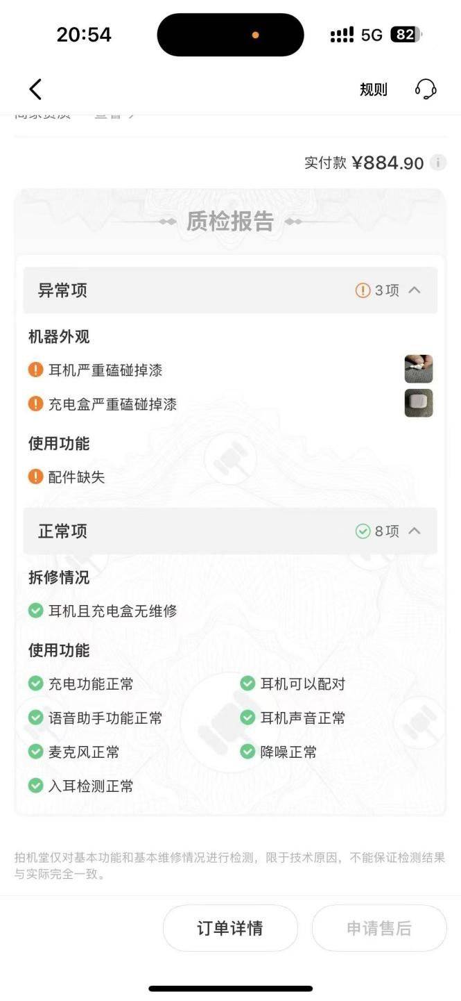 据平台的质检报告,异常项中并未提及耳机和耳机仓为非原配关系。虽然耳机可以正常配对使用,但是郑先生认为拍机堂有责任在验机报告中说明真实情况。“非原配与原配是有差价的,拍机堂也不说清楚,验机根本不仔细”