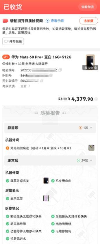 去年12月,魏先生花费4300多元在拍机堂购买了一台华为Mate 60Pro+智能手机,产品的评级为A1,质检报告中的异常项显示该手机只有“外壳细微痕迹”。