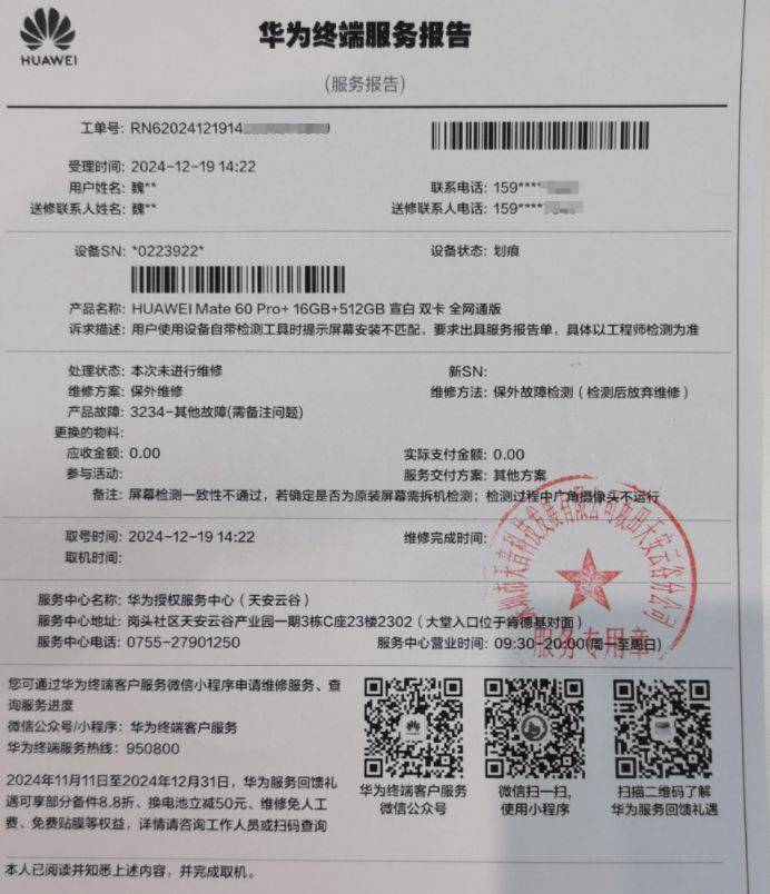 收到货开机后,华为鸿蒙系统提示“屏幕安装不正确”。随后他将手机送至华为官方售后,华为终端服务报告初步显示“屏幕检测一致性不通过”“检测过程中广角摄像头不运行”。这意味着华为官方售后的检测报告“打脸”了拍机堂的质检报告。