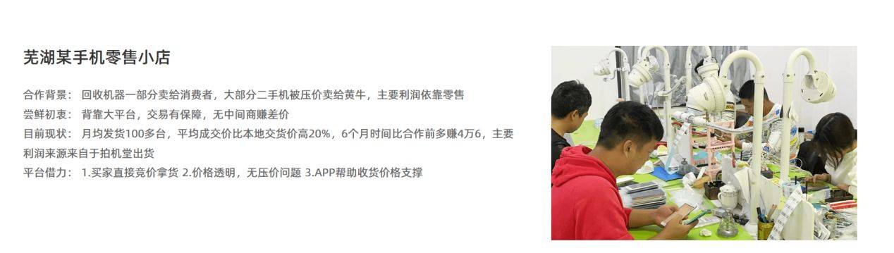 据记者了解,拍机堂存在和手机零售小店合作的经营模式。拍机堂在其官方网站中宣称,芜湖某手机零售小店月均发货100多台手机,平均成交价比本地交货价高20%,6个月时间后比合作前多赚4.6万元,主要利润来源来自拍机堂出货。