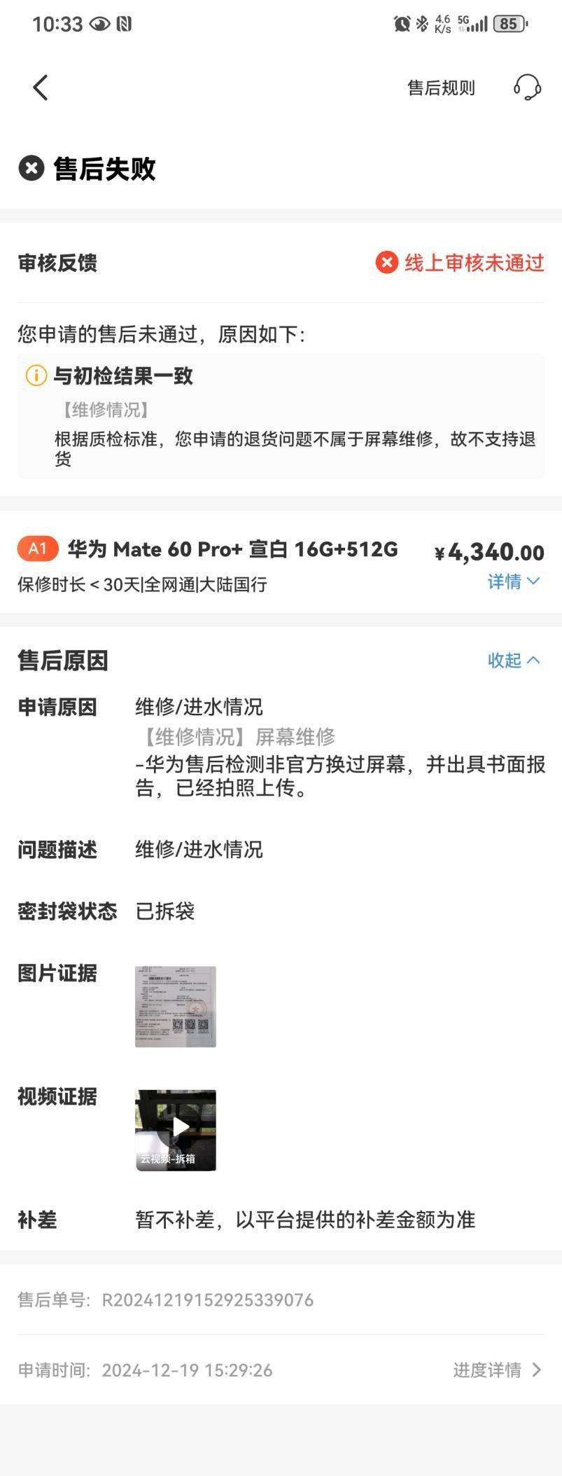 “验机报告根本就没有说屏幕是换过的。也没有说摄像头是有问题的。”面对实际机况和验机报告不符的问题,魏先生发起退货。然而,拍机堂方面并未通过魏先生的退货申请,给出的理由是“机器与初检结果一致,根据质检标准,申请的退货问题不属于屏幕维修,故不支持退货”。