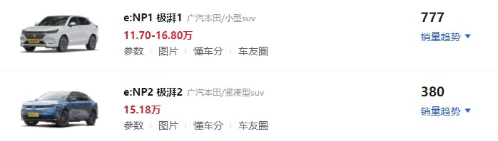 懂车帝数据显示,2024年12月,广汽本田的纯电车型e:NP1极湃1和e:NP2极湃2的单月销量分别仅为777辆和380辆,而东风本田的纯电车型e:NS1和猎光e:NS2单月销量分别仅为317辆和9辆,与头部合资电车的销量表现差距甚远。