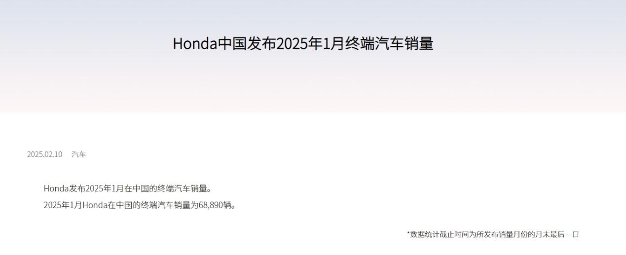 本田中国公布的数据显示,今年1月本田在华终端销量为68890辆,同比大幅下滑近31.8%。