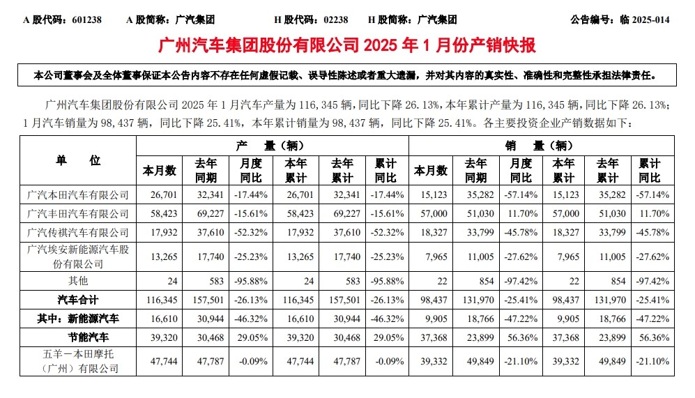 与此同时,本田在华销量也大幅下滑。本田中国公布的最新数据显示,今年1月本田在华终端销量同比大幅下滑近31.8%;广汽集团的数据显示,广汽本田今年1月销量同比下滑57.14%;东风本田今年1月销量则同比下滑69.3%。