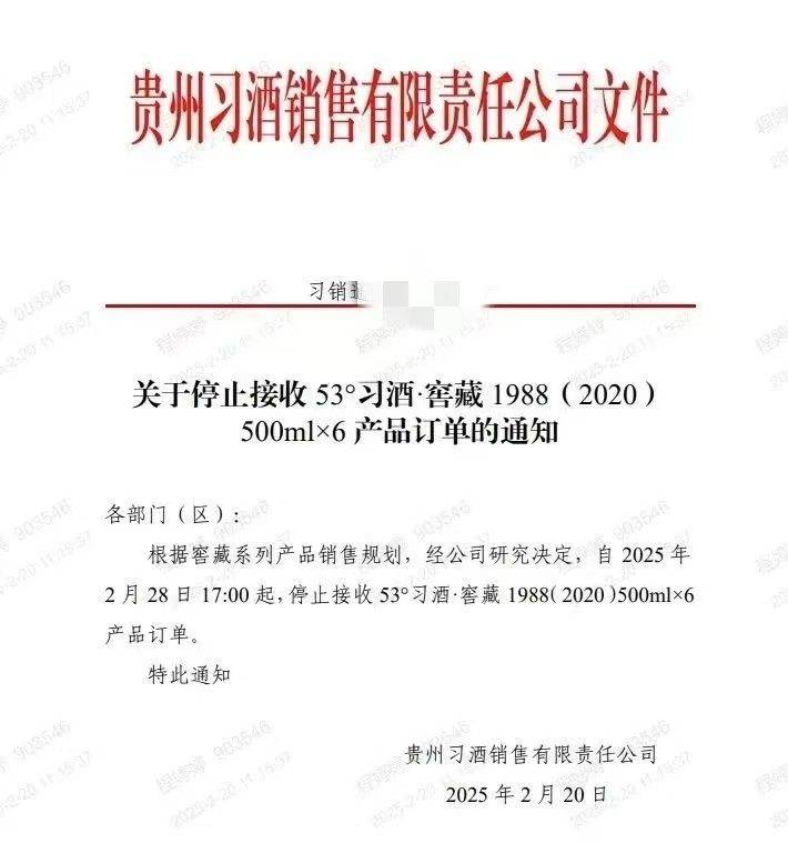 2月20日,有市场消息称贵州习酒销售有限责任公司发布公告,根据窖藏系列产品销售规划,经过公司研究决定,自2025年2月28日17:00起,停止接收53°习酒·窖藏1988(2020)500ml×6产品订单。
