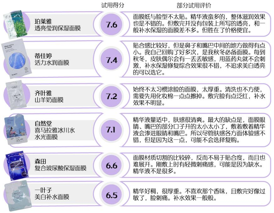 根据试用得分高低,珀莱雅、蒂佳婷、齐叶雅、自然堂、森田、一叶子褒贬参半,排名倒数。珀莱雅缺乏亮点,有志愿者评价“和一般补水保湿的面膜差不多”;蒂佳婷补水修复效果不错,但在膜布剪裁上被诟病较多,其中“鼻子和嘴巴中间的地方做得有点小”;齐叶雅是唯一一款涂抹式面膜,有志愿者表示“敷完脸有点泛红,补水效果不明显”;自然堂有一个明显缺点,志愿者反映其眼睛、嘴巴部分开口太小,使用时精华液会渗进眼睛和嘴巴;森田被认为“不易贴合,而且也难展开”“刚敷上时有轻微刺痛感”;有部分志愿者试用一叶子后出现脸部不适,评价称“敷完好像过敏了,脸刺痛”。